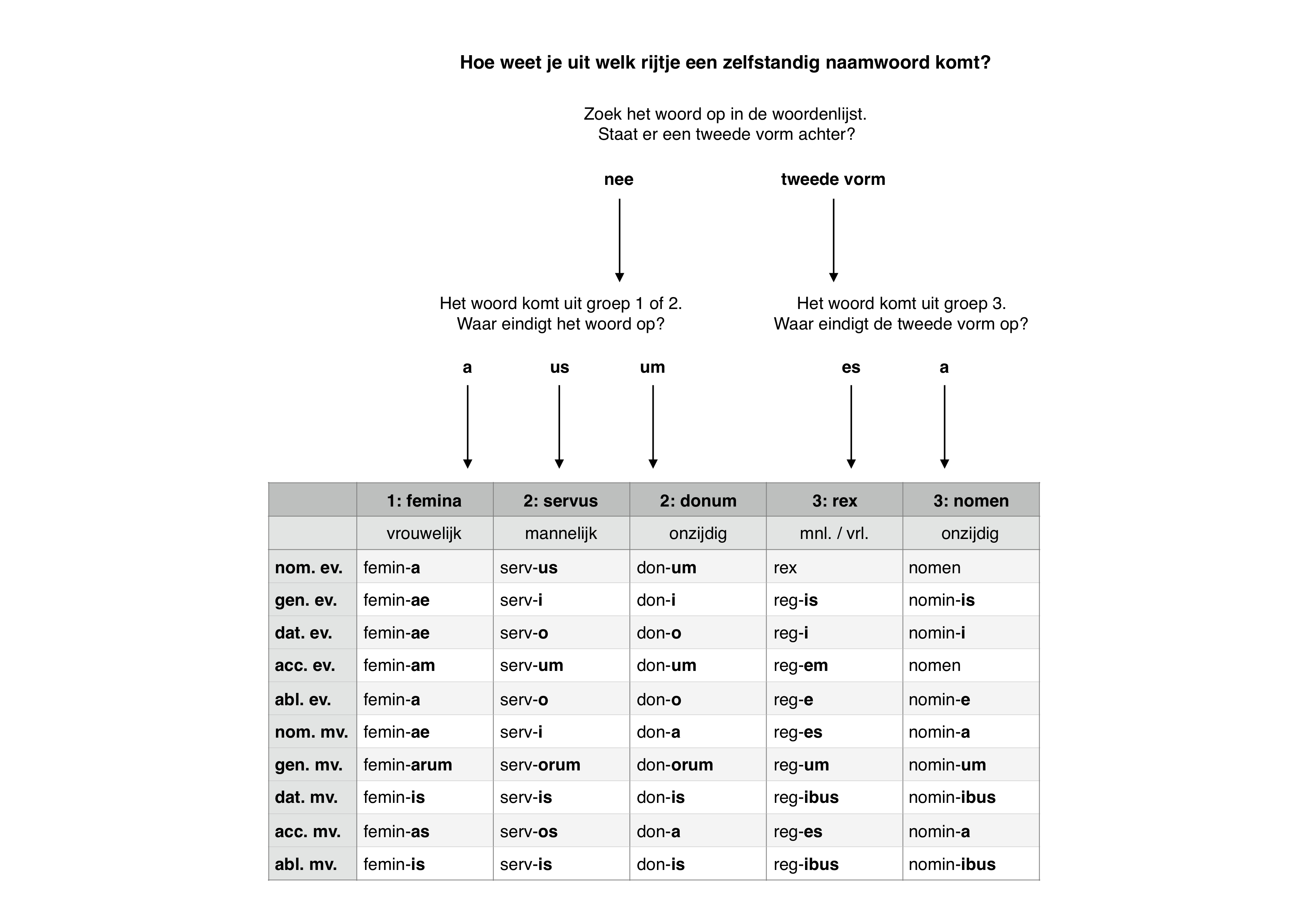 De bovenstaande regels gaan van ‘belangrijk’ naar ‘minder belangrijk’. Een woord als corpus, corpora gaat dus niet volgens servus omdat het op -us eindigt, maar volgens nomen omdat er een tweede vorm op -a achter staat.